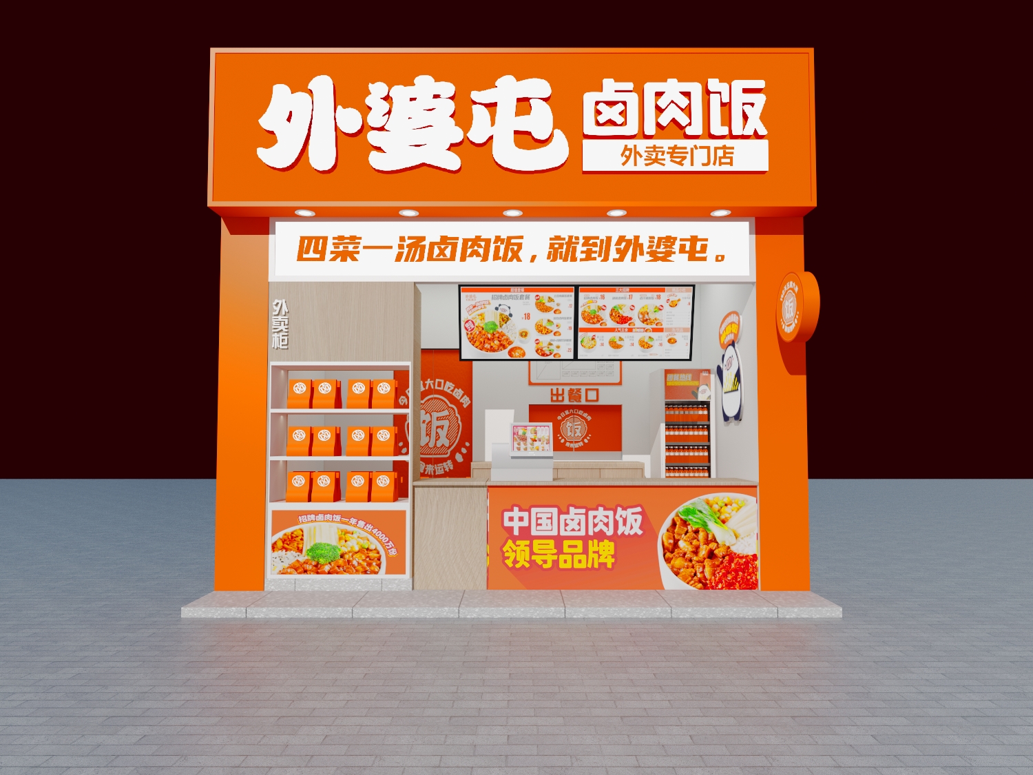 外婆屯卤肉饭历经3次品牌升级,最终定调熊猫猪屯屯作为品牌Ip形象,活力橙为品牌色。